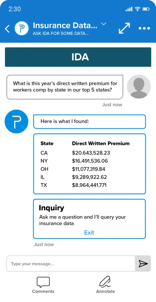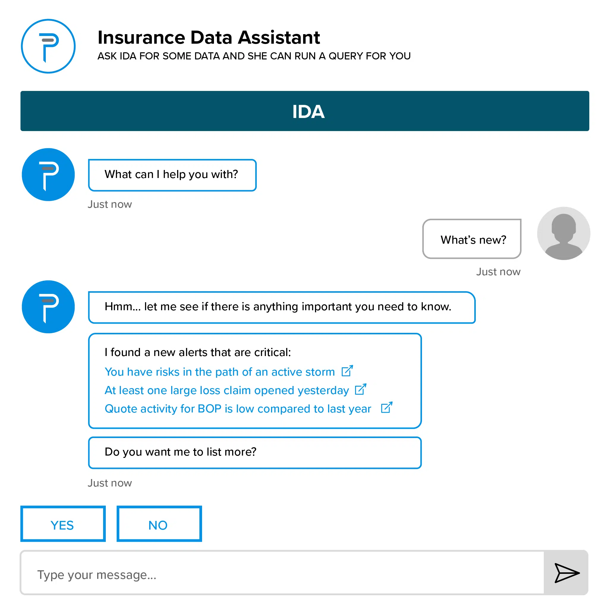 IDA is your multi-channel, GenAI insurance data assistant, within Data Magnifer designed to make report queries and quick hit information lookups fast and easy. IDA can be embedded in custom applications or Microsoft Teams and accessed from any mobile device via browser, voice, or data visualization app.